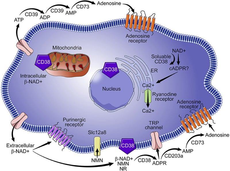 - Hogan, Kelly A., Claudia CS Chini, and Eduardo N. Chini. "The multi-faceted ecto-enzyme CD38: roles in immunomodulation, cancer, aging, and metabolic diseases." Frontiers in immunology 10 (2019): 1187. https://doi.org/10.3389/fimmu.2019.01187